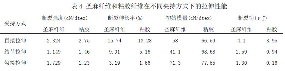 3.2不同夾持方式下斷裂性能測(cè)試圣麻纖維和粘膠纖維在不同夾持方式下的一次拉伸斷裂性能基本指標(biāo)見表4。
