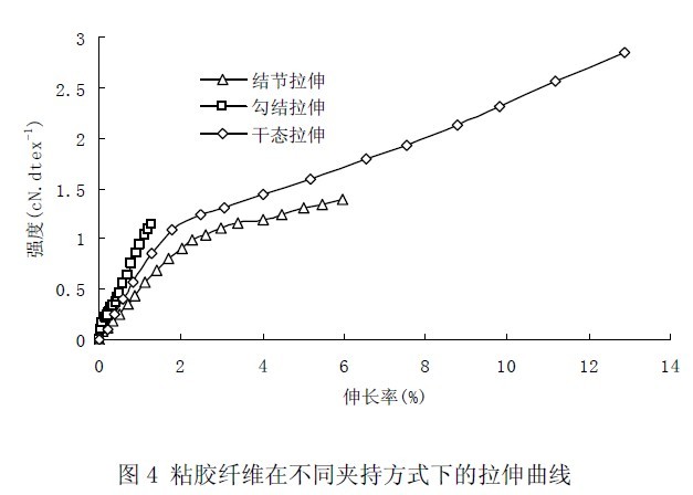 粘膠纖維在不同夾持方式下的拉伸曲線見圖4。