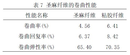 ?。?)圣麻纖維的卷曲率小于粘膠纖維,卷曲回復(fù)率和卷曲彈性率亦小于粘膠纖維,說(shuō)明圣麻纖維卷曲耐久性和卷曲的恢復(fù)能力差于粘膠纖維。