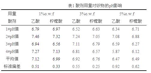 摘要:酸劑在棉漂白織物處理過程中控制不合理,會(huì)導(dǎo)致pH值不合格、織物有酸味等問題。本文通過分析生產(chǎn)加工中酸劑對(duì)棉漂白織物pH值的影響及pH值對(duì)織物白度的影響,推薦選用合適的酸類,來(lái)改善棉漂白織物pH值不穩(wěn)定和有酸味等不足。 關(guān)鍵詞:pH值;乙酸;檸檬酸;漂白;棉 0引言 如今,隨著人們生活水平的提高和對(duì)環(huán)保理念的加強(qiáng),生態(tài)紡織品的pH值已成為安全環(huán)保指標(biāo)中備受重視的考核指標(biāo)之一。由于人體表皮帶有一層弱酸性物質(zhì),因此為防止疾病入侵,紡織品的pH值在弱酸性至中性之間對(duì)皮膚最有益。若皮膚表層的pH值超過人體皮膚適宜的范圍,很容易引起皮膚瘙癢﹑過敏﹑炎癥等疾病,甚至損害人體的汗腺和神經(jīng)系統(tǒng),影響人體健康[1]。因此嚴(yán)格使用酸劑對(duì)控制織物pH值是非常有必要的,目前按國(guó)家標(biāo)準(zhǔn),漂白織物pH值要求范圍是4.5~7.0,歐美標(biāo)準(zhǔn)(ISO,AATCC等標(biāo)準(zhǔn))漂白織物pH值要求在5~7.0。 1實(shí)驗(yàn) 1.1材料及設(shè)備 材料:80S精棉;30%H2O2、氫氧化鈉、硅酸鈉、冰乙酸、檸檬酸均為分析純。 設(shè)備:FA1004N型電子天平、PHS-3C精密PH計(jì)、Datacolor600(D65光源、10°觀察角)色度儀。 1.2工藝流程 高溫坯定→煮漂→增白→pH值中和→出缸→烘干→成品定型→驗(yàn)布→打包→入倉(cāng)[2]。 1.3測(cè)試方法 棉織物pH值按AATCC81-2006pHofWater-ExtractfromWetProcessedTextiles(濕加工織物水萃取pH值)測(cè)定[3]。具體步驟:取(10±0.1)g樣品,如果織物的克重太小,將試樣剪碎。將250mL蒸餾水以適中的速度煮沸10min,放入試樣,用玻璃的表面皿蓋上燒杯,再煮沸10min,將燒杯(連蓋)冷卻到室溫。用鑷子取出試樣,使試樣上殘留的液體流回?zé)?。用pH計(jì)測(cè)定萃取液的pH值。 2.1酸劑用量對(duì)織物pH值的影響 從表1可以看出,漂白織物pH值、平均值與標(biāo)準(zhǔn)偏差值均隨酸劑用量增大而呈現(xiàn)逐漸減小的趨勢(shì),說明隨著酸劑用量的增加,漂白織物pH值變化增大且標(biāo)準(zhǔn)偏差升高。其中, 檸檬酸的pH值變化幅度較小,標(biāo)準(zhǔn)偏差也相對(duì)較低,故檸檬酸對(duì)pH值的穩(wěn)定性控制比乙酸好。如果酸量過大,則在漂白織物降低pH值的同時(shí)易變灰,其白度和色光難以控制,因此,綜合生產(chǎn)成本與表1測(cè)試數(shù)據(jù)得出,酸劑推薦用量為3%o.w.f較適宜。