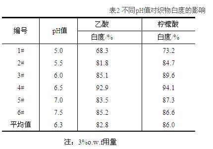 2.2不同pH值對(duì)織物白度的影響 從表2可以看出,pH值小于5.5時(shí)煮練增白的織物白度較低,當(dāng)pH值為6.5左右時(shí)白度達(dá)到最高,之后隨著pH值的增大白度略有所降低,但仍滿足生產(chǎn)需要。結(jié)合漂白后織物的酸性氣味與所測(cè)試的白度可知,pH值控制在6.0~7.0時(shí)較適中而且相對(duì)穩(wěn)定,檸檬酸處理后的漂白織物白度較高,同時(shí)酸味很輕微,適合工廠大批量生產(chǎn)?! ?/p>