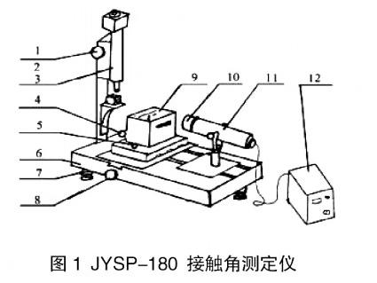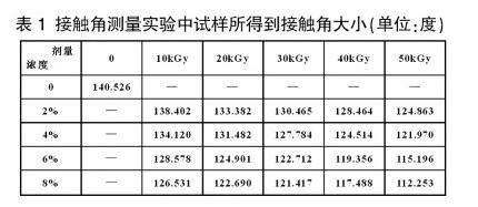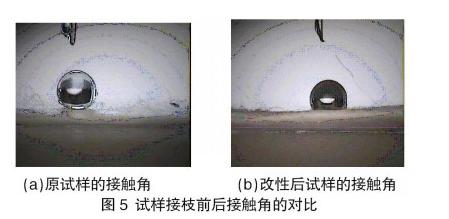 圖4接觸角隨輻照劑量的變化 接觸角測量中所得到的照片如下圖所示: ?。╝)原試樣的接觸角(b)改性后試樣的接觸角