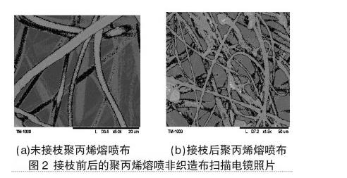 對于聚丙烯熔噴非織造布的親水改性,目前采用的一些方法都存在一些問題,如后整理方法會使聚丙烯熔噴非織造布的耐久性下降,并且隨著時間的延長,親水性物質(zhì)會從纖維上脫落下來而無法獲得持久的親水性。與其他親水改性的方法相比,共輻照親水改性有很多優(yōu)點:自由基利用率高、工藝簡單、單體對高分子材料有輻射保護作用。最為重要的是經(jīng)過輻照親水改性后,非織造布可獲得持久的親水性,同時其常規(guī)性能基本上不受影響。 實驗操作得出關(guān)鍵數(shù)據(jù) 原料:18cm×25cm,52g/m2的聚丙烯熔噴布,去離子水、硫酸銅。 儀器:北京金盛鑫檢測儀器有限公司的JYSP-180接觸角測定儀;日本株式會社日立高新科技那珂事業(yè)所的TM-1000掃描電鏡;上海市精密科學(xué)儀器有限公司的FA2004B電子天平;江蘇無錫愛邦輻射技術(shù)有限公司的GJ-15地那米型電子加速器。 試樣的制備 剪去聚丙烯熔噴布裝于塑料袋中,鼓氮氣10min除去其中的氧氣并密封。取去離子水、丙烯酸(AA)、硫酸銅配置丙烯酸溶液,丙烯酸溶液共分為4個濃度梯度,分別為2%、4%、6%、8%,每份丙烯酸溶液中均加入質(zhì)量分?jǐn)?shù)為3‰的阻聚劑(硫酸銅),將聚丙烯熔噴布浸入改性液中浸泡,通氮氣除去其中的氧氣后密封,并移入60Co-γ射線源室。分10、20、30、40、50kGy五個輻照劑量進行輻照。輻照完成后,將材料移出射線源室。 采用掃描電子顯微鏡(SEM)觀察聚丙烯熔噴非織造布試樣輻照接枝前后的表面形貌,進而對比接枝前后試樣表面形貌的變化。參照標(biāo)準(zhǔn):GB/T16594-2008微米級長度的掃描電鏡測量方法通則。 一是開機。將儀器插上電源,打開電腦,雙擊桌面上的JYSP-180應(yīng)用程序進入主界面,這時可以看到攝像頭拍攝的載物臺上的圖像。二是加入樣品。將微量注射器固定在載物臺上方,裁取一小塊兒樣品放置在注射器正下方。放置樣品時,要使樣品表面產(chǎn)生的圖像盡量平整,并在一條水平線上,不產(chǎn)生起伏不平的圖像。緩慢旋轉(zhuǎn)注射器上方的旋鈕抽取液體,使一滴水滴滴在樣品表面上。這時可以從圖像中看到進樣器下端出現(xiàn)一個小液滴。三是調(diào)焦。調(diào)整攝像頭焦距及攝像頭的高度,直至在圖像中出現(xiàn)一個清晰的小水滴。四是量角法。點擊測量,選擇三點法。進入三點法主界面,然后用鼠標(biāo)左鍵順次點擊液滴的頂端和液滴的左、右兩端與試樣的交點,記錄所得到的接觸角。五是保存圖像。點擊界面左上角的文件按鈕,再點擊保存圖像按鈕將圖像保存在文件夾中。 斷裂強力是在規(guī)定的條件下進行的拉伸試驗的過程中,試樣被拉伸至斷裂時所測得的最大強力。由于熔噴非織造布其纖維的無規(guī)雜亂排序使其縱橫向強力比基本上相同,因此本測試試驗不分縱橫向測試。 數(shù)據(jù)分析確定最佳工藝 通過對輻照接枝前后的聚丙烯熔噴非織造布用掃描電鏡進行掃描,得到其表面形態(tài)的照片如下: (a)未接枝聚丙烯熔噴布(b)接枝后聚丙烯熔噴布 由圖2可以看出,接枝前的纖維表面光滑,直徑均勻,接枝后的纖維表面粗糙、遍布凹坑、鼓泡和顆粒狀突起,且比較均勻地散布在纖維表面;隨著接枝率的增大,粒狀突起增多。這說明了通過輻照的方式丙烯酸與聚丙烯大分子發(fā)生了接枝反應(yīng),在丙綸的表面接枝上了由改性單體丙烯酸組成的聚合物顆粒,達(dá)到了對聚丙烯的接枝改性。 材料表面親水性一般采用接觸角進行表征,接觸角越小,材料表面親水性越強。對試樣的接觸角測量所得結(jié)果如表1所示。