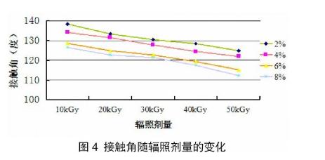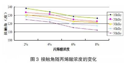 由圖3可以看出,對于每一個恒定的輻照劑量,在丙烯酸濃度為2%~8%之間時,隨著單體丙烯酸濃度的增加,PP接枝物的接觸角逐漸降低,體系中接枝單體的含量相對不足,輻照所產(chǎn)生的PP大分子活性自由基,大部分在斷鏈中消耗,因此當(dāng)丙烯酸的用量增加時,PP分子鏈的斷鏈減少,而接入的極性基團數(shù)量增加,表現(xiàn)出接觸角隨之變小。但是接觸角減小的幅度并不大,這說明經(jīng)過接枝改性后,聚丙烯熔噴布的親水性得到改善,但是改善的效果不是很理想,可能是由于丙烯酸的濃度比較低的緣故。