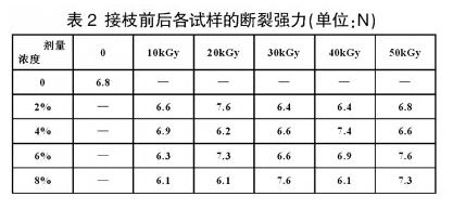 圖5試樣接枝前后接觸角的對比 由圖4可以看出,對于每個恒定的丙烯酸濃度,在輻照劑量為10kGy到50kGy之間時,隨著輻照時間的增大,加快了PP大分子產(chǎn)生自由基的速率,自由基的濃度增大,引發(fā)接枝聚合反應(yīng),使得接枝率上升,親水性得到改善,接觸角隨著減小,并且變動幅度基本上恒定,雖然接觸角的測量表明聚丙烯熔噴非織造布經(jīng)過輻照接枝后親水性得到改善,但是改善的幅度不大,可能是與輻照劑量比較小有關(guān)。 試驗結(jié)果發(fā)現(xiàn),在輻照劑量不變時,丙烯酸濃度在2%到8%之間變化時,隨著丙烯酸濃度的增大,接觸角隨著減小,保水率和透濕性隨著增大;在丙烯酸濃度不變時,輻照劑量在10kGy到50kGy之間時,隨著輻照劑量的增大,接觸角隨著減小,保水率和透濕性隨著增大。 斷裂強力是非織造布力學(xué)性能的重要指標(biāo),通過斷裂強力的測試,可以得到聚丙烯熔噴布在輻照接枝改性前后斷裂強力的變化,據(jù)此可以對比接枝改性前后力學(xué)性能的變化,測試實驗所得到的數(shù)據(jù)如下表所示:
