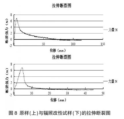 由表2可知,經(jīng)過輻照接枝改性,聚丙烯熔噴布的斷裂強力并沒有改變,各個試樣基本上與原樣的斷裂強力相同,只是值在稍微上下波動,但是波動的區(qū)間很小,這是很正常的。而由圖6及圖7可以看出,在丙烯酸濃度為2%到8%之間、輻照劑量為10kGy到50kGy之間時,斷裂強力并不隨丙烯酸濃度與輻照劑量特征變化,只是在某一個值附近上下波動。在測試試樣中發(fā)現(xiàn),非織造布的斷裂并不是被拉斷,而是發(fā)生層與層之間的滑移,由于熔噴布的斷裂強力本身就小,并且所選的試樣并沒有經(jīng)過固網(wǎng)工序??梢钥闯霰┧釢舛扰c輻照劑量對試樣的斷裂強力沒有明顯的影響。 測試試驗中所得到試樣的拉伸斷裂強力圖如下圖所示: