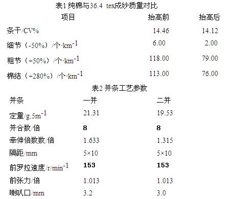 在短纖維紡紗中,可以通過工藝的優(yōu)選降低成紗中的棉結(jié)和粗節(jié)。由于纖維原料中20mm以下的短絨較多,喂入后區(qū)的纖維排列紊亂,棉條內(nèi)在結(jié)構(gòu)差,不適宜大的牽伸倍數(shù)。采用小牽伸倍數(shù),牽伸后進(jìn)入前區(qū)的須條纖維抱合緊密,有利于前區(qū)牽伸,伸直。適當(dāng)加大加壓,可保持纖維在牽伸中運(yùn)動(dòng)穩(wěn)定。并條定量適當(dāng)偏輕控制,既防止喇叭口堵塞,又可以收攏須條,增加纖維間的抱合力。從表1中可看出,在集束區(qū)抬高集棉器5~7mm,可減少纖維集束收攏時(shí)的碰撞摩擦,改善伸直度,平行度,可有效降低成紗中的棉結(jié)。