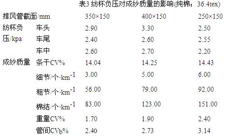 根據(jù)F1603排風(fēng)式轉(zhuǎn)杯紡紗機(jī)的特點(diǎn)和纖維的性能(如表3所示),負(fù)壓在轉(zhuǎn)杯紡紗中有著極其重要的作用。低負(fù)壓,有利于除雜;中負(fù)壓直接關(guān)系到單纖維的轉(zhuǎn)移和輸送,對(duì)雜質(zhì)的清除有一定效果,合理的控制對(duì)降低成紗中的粗細(xì)節(jié),棉結(jié)有十分明顯的作用;高負(fù)壓有利于纖維轉(zhuǎn)移。通過對(duì)排風(fēng)氣流管道截面積的調(diào)節(jié)控制紡杯負(fù)壓,優(yōu)選調(diào)整為350х150mm的截面積,既有利于轉(zhuǎn)移,除雜,也有利于成紗條干。