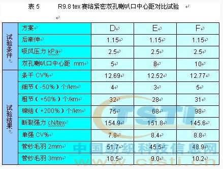 根據(jù)對(duì)比試驗(yàn)確定,吸風(fēng)壓力在2.5KPa時(shí)條干、棉結(jié)、毛羽等指標(biāo)優(yōu)于或同等于2.8KPa時(shí)的指標(biāo),在考慮節(jié)省能源成本,紗線質(zhì)量好的前提下,選擇方案B:2.5KPa的吸風(fēng)壓力。 ?、垭p孔喇叭口中心距試驗(yàn) 雙孔喇叭口中心距的大小決定著賽絡(luò)緊密紡成紗質(zhì)量效果與細(xì)紗斷頭。一般來說中心距加大,有利于纖維的翻滾集聚作用,成紗強(qiáng)力和毛羽會(huì)得到改善,但過大會(huì)影響纖維的排列和均勻分布,造成條干惡化,斷頭增加,接頭難接,生產(chǎn)不正常;中心距過小達(dá)不到賽絡(luò)緊密效果,而且須條偏離了異型管凝聚槽,發(fā)生抖動(dòng),條干和毛羽明顯惡化。所以雙孔喇叭口中心距的大小必須與負(fù)壓異形管倒八字形雙孔集聚槽相配。我公司雙孔喇叭口中心距通過幾組對(duì)比試驗(yàn),確定為8mm時(shí)毛羽、條干最優(yōu)(見表5方案E)