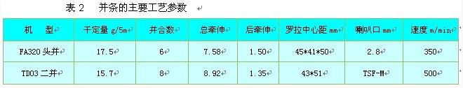 3.2 并條 特呂茨勒的TD03并條自調(diào)勻整系統(tǒng)屬于全伺服形式,該系統(tǒng)采用的是漏斗式傳感器測(cè)量棉條的靈敏度,準(zhǔn)確率很高,且換筒期間的減速和加速過程也被勻整,因此保證了每米質(zhì)量的最優(yōu)化。并條工序的工藝設(shè)計(jì)對(duì)纖維的混合及成紗的條干質(zhì)量起著關(guān)鍵性的影響,特別是牽伸倍數(shù)及其分配的設(shè)定、羅拉隔距大小的確定,直接影響著熟條的條干和棉結(jié)。針對(duì)粘膠纖維的特性,為保證纖維之間的充分混合和降低成紗重量不勻率,并條工序采用二道并合的方式,以“小隔距、小張力”的工藝原則。為改善熟條條干,二并采用較小的后區(qū)牽伸倍數(shù),同時(shí)采用偏小的牽伸羅拉隔距。并條工序的主要工藝參數(shù)見表2:
