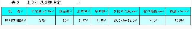 3.3粗紗工序 為了加強(qiáng)對(duì)牽伸區(qū)纖維的控制,粗紗工藝采用“小隔距、輕定量、中檔加壓、較小的后區(qū)牽伸、低速度”的工藝配置原則。由于細(xì)紗采用賽絡(luò)紡雙根粗紗喂入,粗紗定量宜偏輕掌握,定量為3.5g/10m。賽絡(luò)緊密紡細(xì)紗退繞時(shí)引紗距離比普通環(huán)錠紡引紗距離長,張力較大,粗紗退繞時(shí)容易產(chǎn)生斷頭,為保證粗紗正常退繞,在細(xì)紗不出“硬頭”的前提下,適當(dāng)增大粗紗捻系數(shù),即可減少粗紗退繞時(shí)意外伸長,又可賽絡(luò)緊密紡時(shí)增加細(xì)紗前區(qū)須條緊密度,從而減少成紗細(xì)節(jié)及毛羽,提高成紗強(qiáng)力,但粗紗捻系數(shù)不易過大,否則細(xì)紗牽伸不開吐硬頭。一般粗紗捻系數(shù)掌握在75~80之間,我公司采用80捻系數(shù)。為確保粗紗品質(zhì),適當(dāng)降低錠速。小紗錠速為900r/min,大紗為950r/min,,中紗采用1000r/min,可以減少斷頭率,保證粗紗生產(chǎn)正常運(yùn)行。 FA468E粗紗機(jī)采用4個(gè)電機(jī)分別傳動(dòng)牽伸羅拉、錠子、錠翼及龍筋,在計(jì)算機(jī)控制下完成粗紗的牽伸與卷繞成形,同時(shí)采用了張力傳感器對(duì)粗紗卷繞全過程中的粗紗張力進(jìn)行檢測(cè)與控制。