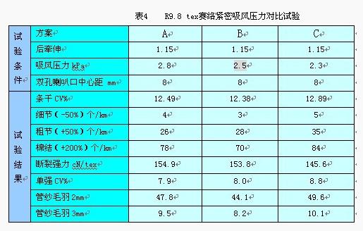 圖1 賽絡(luò)緊密紡系統(tǒng) 3.4.2工藝配置 賽絡(luò)緊密紡的工藝配置是一項(xiàng)綜合性很強(qiáng)的工作,羅拉隔距、后區(qū)牽伸倍數(shù)、搖架壓力、細(xì)紗捻系數(shù)、鋼令鋼絲圈型號(hào)、雙孔喇叭口中心距、吸風(fēng)壓力等,必須逐項(xiàng)優(yōu)選。由于R9.8tex賽絡(luò)緊密紗屬于我公司的新產(chǎn)品,沒有現(xiàn)成的經(jīng)驗(yàn)可循。羅拉隔距、細(xì)紗捻系數(shù)我們參考國產(chǎn)賽絡(luò)紡長車60支紗的經(jīng)驗(yàn),確定為羅拉隔距44*63mm,捻度1088捻/米,捻系數(shù)為341;后區(qū)牽伸剛開始選用1.19倍時(shí)條干不好,后羅拉有輕微打頓現(xiàn)象,原因是車身較長,牽伸羅拉容易出現(xiàn)扭振,改為1.15后打頓現(xiàn)象消除,條干明顯好轉(zhuǎn);搖架壓力:前16*中10*后12kg,前皮輥加壓由偏心多邊塊直接調(diào)節(jié)。對(duì)于其他參數(shù),做出如下對(duì)比試驗(yàn)后優(yōu)選。 ?、黉摻z圈試驗(yàn) 由于賽絡(luò)緊密紡紗線毛羽少,結(jié)構(gòu)緊密,超低的毛羽導(dǎo)致鋼領(lǐng)和鋼絲圈動(dòng)摩擦的潤滑不足,鋼絲圈在鋼領(lǐng)的回轉(zhuǎn)面上受到相當(dāng)大的摩擦力,使鋼絲圈過早磨損,從而導(dǎo)致鋼絲圈運(yùn)行不穩(wěn)定、紗線張力波動(dòng)和紗線質(zhì)量下降。分析認(rèn)為是粘膠纖維對(duì)通道的摩擦很敏感,因?yàn)镽9.8tex紗較細(xì),使得鋼絲圈與鋼令的接觸面較多,鋼絲圈容易磨損,尤其重量偏重時(shí)更易磨損,反而會(huì)造成紗線毛羽增多,斷頭、棉結(jié)增加。鋼絲圈圈型合適時(shí),會(huì)減少對(duì)紗條的摩擦作用,紗條耐磨度增加,因而不易產(chǎn)生棉結(jié)。所以,必須配置與此相適應(yīng)的鋼領(lǐng)、鋼絲圈,否則,會(huì)造成大量斷頭,因此,使用抗磨損的鋼領(lǐng)對(duì)賽絡(luò)緊密紡而言是非常重要的。 我公司選擇了BrackerTITAN鋼領(lǐng)和Bracker鋼絲圈。鋼絲圈型號(hào)重量的選擇對(duì)賽絡(luò)緊密紡R9.8tex成紗千米棉結(jié)和斷頭的影響很大,最初我們使用瑞士BrackerC1ULudr10/0的鋼絲圈,成紗千米棉結(jié)(+200%)達(dá)90個(gè),千錠時(shí)斷頭比較多,為25根/千錠時(shí);通過試驗(yàn),當(dāng)減輕一號(hào)后用C1ULudr11/0,細(xì)紗生活明顯好做,千米棉結(jié)降到70個(gè)左右,千錠時(shí)斷頭15根以內(nèi)。適當(dāng)減輕鋼絲圈號(hào)數(shù),控制了氣圈形態(tài),減少了因鋼絲圈偏重引起的斷頭、毛羽、棉結(jié)增加。 ?、谖L(fēng)壓力試驗(yàn) 適當(dāng)?shù)呢?fù)壓值是賽絡(luò)緊密紡減少毛羽的必備條件,一般來講,負(fù)壓氣流流速加快,對(duì)紗條表面的作用增強(qiáng),紗線指標(biāo)明顯好轉(zhuǎn),但是,負(fù)壓值也不是越大越好,太大不僅能耗增大,而且由于不同特性的纖維適應(yīng)不同的負(fù)壓值,負(fù)壓值太大效果反而不好。實(shí)驗(yàn)表明,纖維素纖維整齊度好,強(qiáng)力大,負(fù)壓值一般偏小掌握。開車時(shí)可觀察須條是否被負(fù)壓管集聚槽吸附在一直線上。如果須條集聚緊密,說明負(fù)壓就夠了;反之,須條集聚松散,說明負(fù)壓不夠。在試紡初期對(duì)吸風(fēng)壓力做了試驗(yàn)優(yōu)選,如表4: