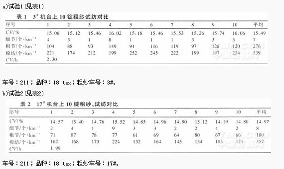 由試驗(yàn)結(jié)果可以看出,用17#車的粗紗,其成紗質(zhì)量明顯優(yōu)于3#車的粗紗;3#車粗紗的差異給細(xì)紗條干CVb值造成嚴(yán)重影響;因此,必須盡最大可能提高粗紗質(zhì)量,減小粗紗臺(tái)間、錠間差異,建立嚴(yán)格的粗紗質(zhì)量把關(guān)制度,嚴(yán)防疵品流人下工序。 1.2粗紗容量影響 在生產(chǎn)實(shí)踐中,由于受粗紗機(jī)型或紡紗品種的限制,在紡?fù)黄贩N時(shí)可能會(huì)使用不同機(jī)型、長(zhǎng)短不一致的粗紗管或大小粗紗交叉混用。由于長(zhǎng)短粗紗管所紡粗紗及大小粗紗管的退繞半徑不同,使其退繞張力不一致,從而造成細(xì)紗牽伸過程中握持力、牽仲力的不一致,導(dǎo)致影響成紗條干質(zhì)量;試驗(yàn)數(shù)據(jù)見表3,