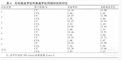 1.3粗紗定量的影響 粗紗定量對(duì)成紗條干也有一定的影響,—般對(duì)紡某一品種細(xì)紗來說,粗紗定量越大越不利于細(xì)紗工序的牽伸控制,導(dǎo)致成紗條干有所降低;因此,在生產(chǎn)實(shí)踐中應(yīng)掌握的原則是:在保證細(xì)紗供應(yīng)的前提下,粗紗定量偏小掌握。 2細(xì)紗相關(guān)牽伸部件的影響 細(xì)紗羅拉、膠輥、膠圈、上、下銷等牽伸部件的質(zhì)量及運(yùn)轉(zhuǎn)狀態(tài),將直接影響成紗質(zhì)量,不管哪—部分出現(xiàn)問題,都會(huì)降低甚至惡化成紗條干。 2.1羅拉及運(yùn)行狀態(tài)問題 細(xì)紗羅拉是牽仲的主要部件,羅拉彎曲、扭振、跳動(dòng)或運(yùn)轉(zhuǎn)不穩(wěn),都會(huì)造成牽仲不穩(wěn),惡化成紗條干,在波譜圖上8cm%處顯示明顯機(jī)械波;因此,要求車間保全在平裝羅拉時(shí),要高標(biāo)準(zhǔn)、嚴(yán)要求、嚴(yán)格執(zhí)行操作規(guī)程;要利用百分表逐節(jié)測(cè)定,使羅拉彎曲偏心保持在5‰以內(nèi);要嚴(yán)格檢查羅拉軸承,損壞的要及時(shí)更換,以保證羅拉運(yùn)行平穩(wěn);另外,在經(jīng)濟(jì)條件允許的情況下,要積極引進(jìn)使用新型的無機(jī)械波羅拉,這對(duì)于降低成紗條干大有神益。我們?cè)鴮?duì)無機(jī)械波羅拉和普通羅拉進(jìn)行同粗紗試對(duì)比,其結(jié)果見表4。
