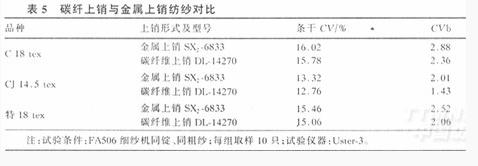 2.2膠輥運(yùn)行狀態(tài) 在生產(chǎn)同一批紗時(shí),應(yīng)保證所用膠輥型號(hào)、新舊程度、直徑相同的同時(shí),還要求做到無刀傷、損傷、中凹現(xiàn)象;以防止由于膠輥圓整度不合格造成運(yùn)轉(zhuǎn)過程中膠輥與羅拉之間產(chǎn)生沖擊或滑溜而導(dǎo)致條干惡化。此外,還要求膠輥表面涂料或光照均勻,膠輥芯子回轉(zhuǎn)靈活,膠輥偏心必須控制在5%以內(nèi),擋車工要嚴(yán)格執(zhí)行操作規(guī)程,處理膠輥纏花時(shí)嚴(yán)禁使用刀割。 2.3膠圈、上下銷狀態(tài)影響 膠圈及上、下銷組成的鉗口對(duì)所控制纖維的順利運(yùn)行起著決定作用,若上銷變形或鐵質(zhì)上銷鉗口面磨損、有毛刺,就易造成膠圈打頓,拉傷膠圈,尤其是一些上銷板簧質(zhì)量不好,運(yùn)行中途斷裂、失效;批與批之間板簧性能差異較大,造成膠圈起浮不穩(wěn),控制浮游纖維能力下降,牽伸不穩(wěn)定,從而影響成紗條干均勻度。同時(shí),如果拆裝上銷方法不當(dāng),用力不均勻,也易造成上銷扭曲變形,使條干惡化。 在實(shí)際生產(chǎn)中,我們對(duì)金屬上銷和碳纖上銷的使用情況進(jìn)行了對(duì)比,發(fā)現(xiàn)碳纖維上銷相對(duì)金屬上銷而言,其剛度、韌性較好,抗變形能力強(qiáng),具有優(yōu)良的自張力功能,膠圈運(yùn)轉(zhuǎn)穩(wěn)定,成紗質(zhì)量穩(wěn)定;碳纖維上銷的成紗質(zhì)量確實(shí)要優(yōu)于金屬上銷,其質(zhì)量對(duì)比情況見表5。