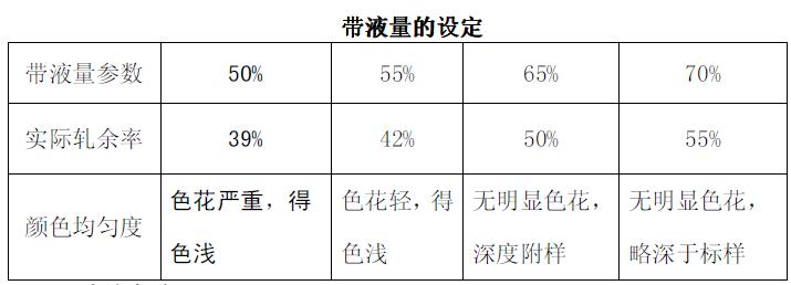 根據(jù)實驗結(jié)果設(shè)定工藝參數(shù)量:發(fā)泡劑用量:3%;泡比8.5;帶液量65%,連續(xù)調(diào)整試驗,染色基本均勻,生產(chǎn)效率提高67%,連續(xù)試驗中,仍存在以下缺點: