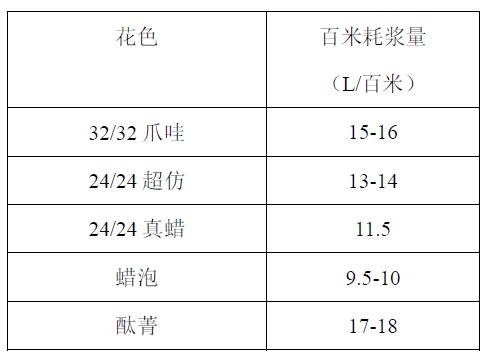 3.2、百米耗漿累計值統(tǒng)計。對不同印制品種、花色的百米耗漿累計統(tǒng)計值,工藝員、色漿調(diào)制人員應(yīng)心中有數(shù),它能夠大體估算每個色漿的配制數(shù)量。一般用以下公式可計算出理論耗漿量(近似值):色漿理論用量=百米耗漿量*印制數(shù)量*印制色面積*修正值例如,我們對純棉真蠟印花生產(chǎn)中常見花色的耗漿統(tǒng)計如下: