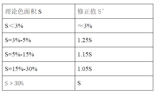 3.1、色面積:單位數(shù)量內(nèi)印制色面積越大,則耗漿越高。理論上在給漿量一致時,百米耗漿量與色面積成正比。但實際生產(chǎn)時發(fā)現(xiàn),印制面積越小,則單位色面積百米耗漿反而上升,這與實際印制面積擴大有關(guān)(大部分原因是線條滲化造成實際印制面積增大)。我們曾對純棉織物實際色面積做過修正處理如下: