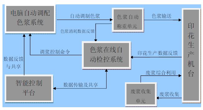 針對此,我們提出了用印花機色漿消耗在線監(jiān)控自動管理系統(tǒng)來精確控制色漿配制。其原理是:先根據(jù)理論計算值預(yù)配制少量色漿(不超過理論值60%)供印花機使用。在印花機上安裝有色漿自動稱重控制系統(tǒng),待印花機調(diào)整各種參數(shù)至生產(chǎn)穩(wěn)定狀態(tài)后,系統(tǒng)計算機根據(jù)色漿耗用情況,自動計算出當前百米耗漿量、剩余色漿配置數(shù)量等參數(shù),并將這些信息反饋至自動調(diào)漿系統(tǒng)。因為生產(chǎn)各個工藝已經(jīng)調(diào)整到位,這些參數(shù)準確度非常高。自動調(diào)漿系統(tǒng)根據(jù)機臺反饋出來的數(shù)據(jù),自動進行剩余色漿配制信息的運算,管理人員只需一個確認執(zhí)行的命令,即可將剩余色漿用量準確的調(diào)制出來,從而實現(xiàn)了色漿的精確控制,準確無誤。