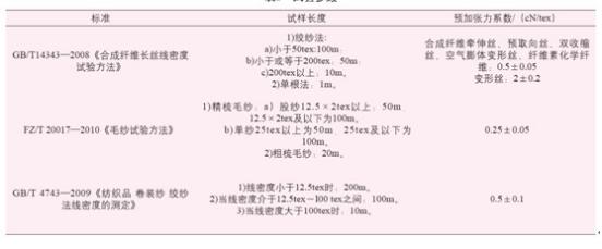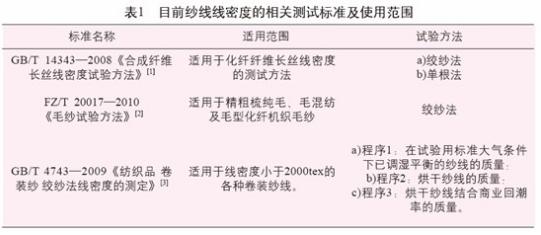 目前測試紗線線密度比較常用的標準方法如表1所示。