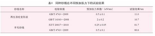 根據(jù)GB/T14343—2008、GB/T4743—2009、FZ/T20017—2010研究同種紗線在不同的預加張力條件下,測試紗線線密度,測試結(jié)果如表4所示。