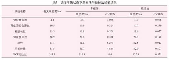 采用單根法和絞紗法,變形絲按名義線密度(2.0±0.2)cN/tex施加預加張力,其他紗線按名義線密度(0.5±0.1)cN/tex施加預加張力。單根法試樣長度1m,測試20根;絞紗法試樣長度100m,測試20絞,分別計算其平均值和CV值,試驗結(jié)果如表3所示。