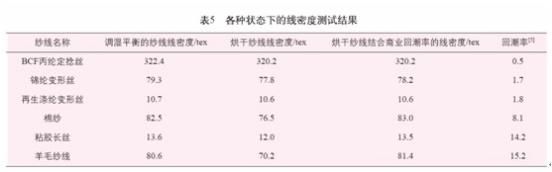 先將紗線按GB/T6529—2008[4]要求,在相對濕度10.0%~25.0%、溫度小于等于50℃下進行預調(diào)濕,然后在溫度(20±2)℃、濕度(65±4)%的環(huán)境下平衡24小時,保證紗線的回潮率小于公定回潮。測定相同絞紗在不同狀態(tài)下的線密度。測試結(jié)果如表5所示。