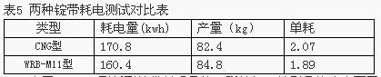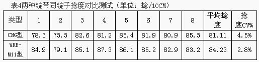 由于WRB-M11型新型錠帶材質(zhì)柔軟、彈性好,特別是接頭表面平整,軟硬與帶體一致,在高速的彎折傳動(dòng)中穩(wěn)定性好,在同樣的帶輪加壓下,錠帶與錠盤、帶托接觸好,運(yùn)行平穩(wěn),滑溜率少,從而無功損耗少,達(dá)到節(jié)電的目的。在同等條件下經(jīng)實(shí)際測(cè)定,該新型錠帶要比CNG型錠帶單耗要低,效益可觀。