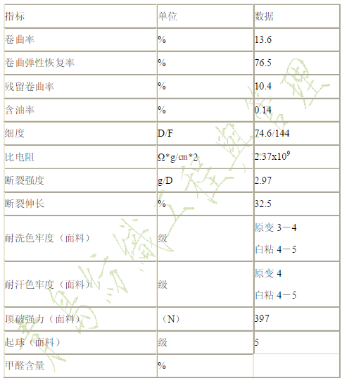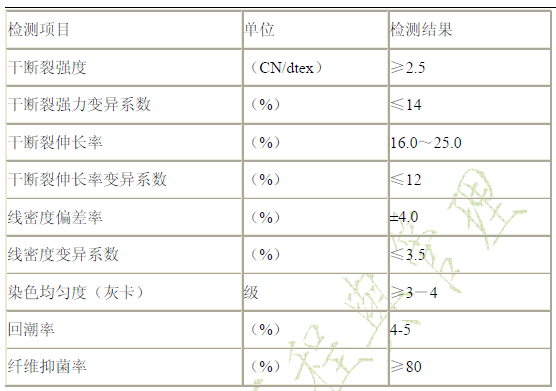 由于牛奶纖維的理、化性能既有別與棉、麻、絲、毛等天然纖維,又與錦綸、腈綸、滌綸和丙綸等化纖不一樣,因此其性能介于天然纖維與合成纖維之間。其物化指標(biāo)檢測值如下: