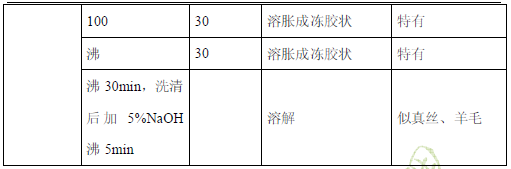 在100%:下用2.5%NaOH溶解30min,纖維溶脹成凍膠狀(區(qū)別于羊毛和真絲),燃燒時有蛋白質(zhì)臭味(區(qū)別于化纖、棉、麻等非蛋白質(zhì)纖維)。