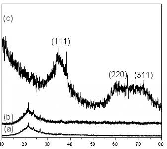 根據(jù)XRD圖分析,其中曲線a是PCS原纖的X射線衍射曲線,曲線b是預(yù)氧化后纖維的X射線衍射曲線,曲線c是煅燒后纖維的X射線衍射曲線,曲線a和b中未出現(xiàn)SiC的特征峰,曲線c中分別在2θ=35、60和70附近出現(xiàn)了β-SiC碳化硅的特征峰,由此可知,在實(shí)驗(yàn)煅燒后成功得到了SiC納米纖維,且SiC的晶型是β型。