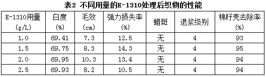 在確定NaOH的用量為20g/L的條件下,采用不同用量的E-1310進(jìn)行實(shí)驗(yàn),探討其對(duì)前處理效果的影響規(guī)律,實(shí)驗(yàn)結(jié)果見(jiàn)表2。