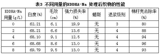 對(duì)于高濃度雙氧水低堿工藝,選用優(yōu)良的雙氧水穩(wěn)定劑,使雙氧水能與較濃的堿液共存至關(guān)重要。EDDHA-Na是一種性能優(yōu)異的金屬離子控制劑。為此,我們選擇不同用量的EDDHA-Na作為雙氧水的穩(wěn)定劑進(jìn)行實(shí)驗(yàn),結(jié)果見(jiàn)表3。