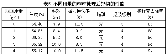 脂肪酸甲酯乙氧基化物(FMEE)的去油除蠟?zāi)芰?yōu)異,現(xiàn)對(duì)其用量進(jìn)行優(yōu)化,以降低加工成本,實(shí)驗(yàn)結(jié)果見(jiàn)表5。