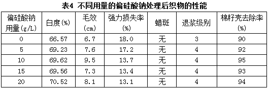 由表4可知,當(dāng)軋液中不加偏硅酸鈉時(shí),織物的白度和毛效都相對(duì)較低。當(dāng)加入5g/L的偏硅酸鈉時(shí),織物便獲得很高的白度和毛效。隨著偏硅酸鈉用量的增加,織物的白度雖有上升但增幅不大,而織物的毛效隨著偏硅酸鈉的用量的增加,先上升后下降,并在偏硅酸鈉用量為10g/L時(shí)達(dá)到最大值。綜合考慮,偏硅酸鈉的用量?jī)?yōu)選10g/L。