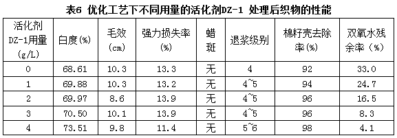 根據(jù)上述單因素實(shí)驗(yàn),優(yōu)選如下工藝進(jìn)行實(shí)驗(yàn):NaOH20g/L、30%H2O280g/L、偏硅酸鈉10g/L、EDDHA-Na4g/L、螯合分散劑CM-54g/L、高效滲透劑2g/L、FMEE2g/L、E-13102g/L。此外,在優(yōu)選工藝中加入不同用量的漂白活化劑DZ-1,以期進(jìn)一步提高處理后織物的性能,實(shí)驗(yàn)結(jié)果見(jiàn)表6。
