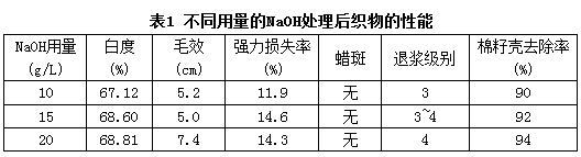 本試驗(yàn)的目的之一是降低傳統(tǒng)冷軋堆前處理工藝中的堿的用量。為此,設(shè)定如下工藝配方進(jìn)行實(shí)驗(yàn),探討低堿條件下高濃度雙氧水低溫前處理的效果:NaOH10~20g/L、30%H2O280g/L、偏硅酸鈉15g/L、EDDHA-Na4g/L、螯合分散劑CM-54g/L、高效滲透劑2g/L、FMEE4g/L、E-13101g/L,實(shí)驗(yàn)結(jié)果見(jiàn)表1。