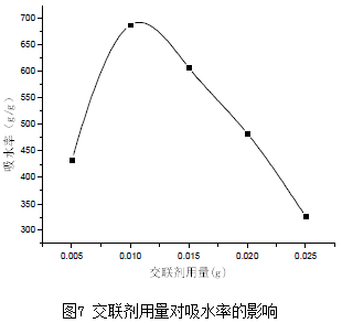 其他反應(yīng)條件不變,考察交聯(lián)劑用量對吸水率的影響如圖7所示。
