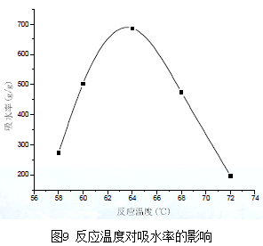 由圖9可以看出最佳反應(yīng)溫度為64℃,此時(shí)吸水率最大。這是因?yàn)榉磻?yīng)溫度低時(shí),反應(yīng)速率慢,反應(yīng)所需的時(shí)間長,生產(chǎn)效率低,而且因?yàn)闇囟鹊?,引發(fā)劑分解速度慢,引發(fā)誘導(dǎo)期時(shí)間長,反應(yīng)積累到一定階段會(huì)突然爆聚,故吸水率較低;反應(yīng)溫度升高,體系粘度下降,單體易于分散,而且有利于引發(fā)劑的分解,單體轉(zhuǎn)化率高,吸水率增加;但溫度過高聚合物分子量小且分布不均勻,導(dǎo)致吸水率降低;溫度過高,體系熱難以散去,造成局部產(chǎn)物自交聯(lián),降低吸水率;溫度過高,引發(fā)劑分解速度快,反應(yīng)速率較快,生產(chǎn)的反應(yīng)熱散失困難,容易產(chǎn)生爆聚。
