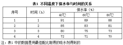 由表1可以看出,纖維素接枝丙烯酸類高吸水性樹脂的保水性較好,即使在80℃經(jīng)4h仍能保持70%的水分。同一時(shí)間里,40℃、60℃、80℃的保水率