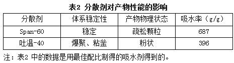 Span-60作為分散劑,它的用量主要影響分散效果的好壞,進(jìn)而影響產(chǎn)品的外形及散熱情況等,固定其他反應(yīng)條件不變,考察分散劑對產(chǎn)品吸水率的影響。