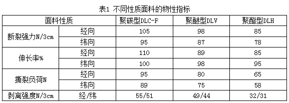 從表1數(shù)據(jù)可以看出聚碳性質(zhì)的面料各項(xiàng)物性指標(biāo)最高,聚醚其次,聚酯性能最低。間接反映出聚碳性質(zhì)面料結(jié)合性能最好。