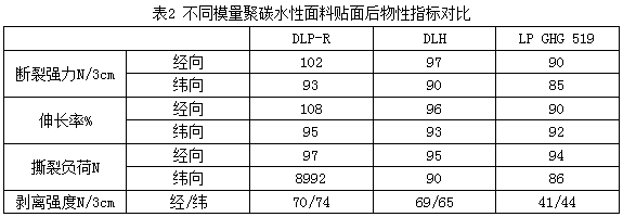 相同性質(zhì)不同模量的面料與發(fā)泡層的結(jié)合強(qiáng)度不一樣,本研究通過(guò)物理性能的指標(biāo),間接的反映其結(jié)合強(qiáng)度,具體數(shù)值如表2所示。