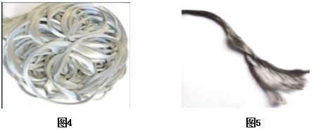 金屬纖維原料目前主要有兩種見圖4、5。未經(jīng)過“波壓”,纖維呈平直狀,纖維抱合力較差,經(jīng)小樣試驗,在并條工序容易產(chǎn)生斷金屬纖維束絲條現(xiàn)象。而選擇圖片1具有波壓過的金屬纖維束絲,在并條引出條時極少發(fā)生斷條現(xiàn)象,從而避免缺金屬纖維條開車的質(zhì)量問題發(fā)生。