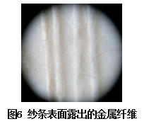 在10×10倍顯微鏡下觀察對,金屬纖維由于比重相對而言棉纖維大,在高速氣圈的作用下,金屬纖維頭部的離開棉紗的現(xiàn)象(圖片6),提示在捻系數(shù)設(shè)計時需要偏大掌握,這樣可以使得毛羽適當(dāng)減少的同時,金屬纖維毛羽也能適當(dāng)減少。