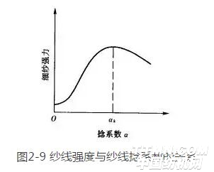 加捻對紗線強度的影響,是以上有利因素與不利因素的對立統(tǒng)一。在捻系數(shù)較小時,有利因素起主導作用,表現(xiàn)為紗線強度隨捻系數(shù)的增加而增加。當捻系數(shù)達到某一值時,表現(xiàn)為不利因素起主導作用,紗線的強度隨捻系數(shù)的增加而下降,如圖2—9所示。紗的強度達到最大值時的捻系數(shù)叫臨界捻系數(shù)(圖中的ak),相應的捻度稱臨界捻度。工藝設計中一般采用小于臨界捻系數(shù)的捻度,以在保證細紗強度的前提下提高細紗機的生產(chǎn)效率。