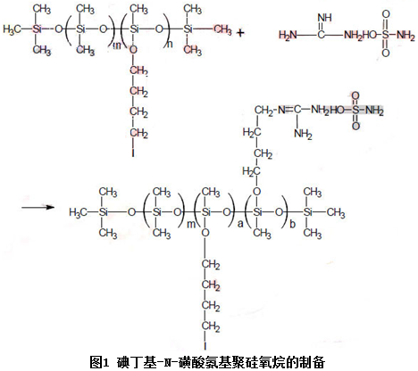 在250mL三頸燒瓶中加入氨基磺酸胍阻燃劑,裝好普通蒸餾裝置,氮氣保護,升溫至80℃,滴加碘丁基硅油,在此反應溫度下反應6h,冷卻。反應式如圖1。