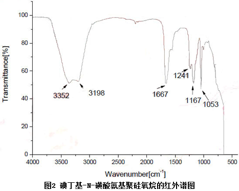 碘丁基-N-磺酸氨基聚硅氧烷的紅外光譜如圖2所示,1053cm-1為Si-O-Si的伸縮振動吸收峰,3352-3198cm-1為伯胺N-H的對稱和不對稱伸縮振動吸收峰,1667cm-1為C=N的伸縮振動吸收峰,1241cm-1為C-N的伸縮振動吸收峰,這些特征基團吸收峰表明氨基磺酸胍與帶活性基團的碘丁基硅油發(fā)生反應生成了碘丁基-N-磺酸氨基聚硅氧烷。
