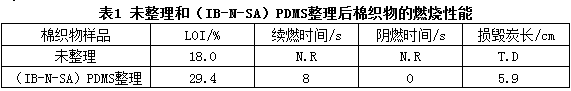 對未整理和(IB-N-SA)PDMS整理后棉織物的燃燒性能進行測試,結果列在表1。
