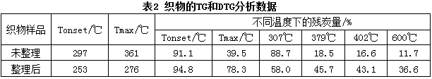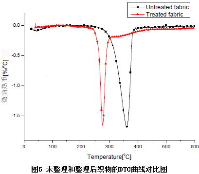 由4可以看出,未整理和整理后棉織物的熱降解曲線趨勢相同,均分為初始降解階段、主要降解階段和殘渣降解階段。